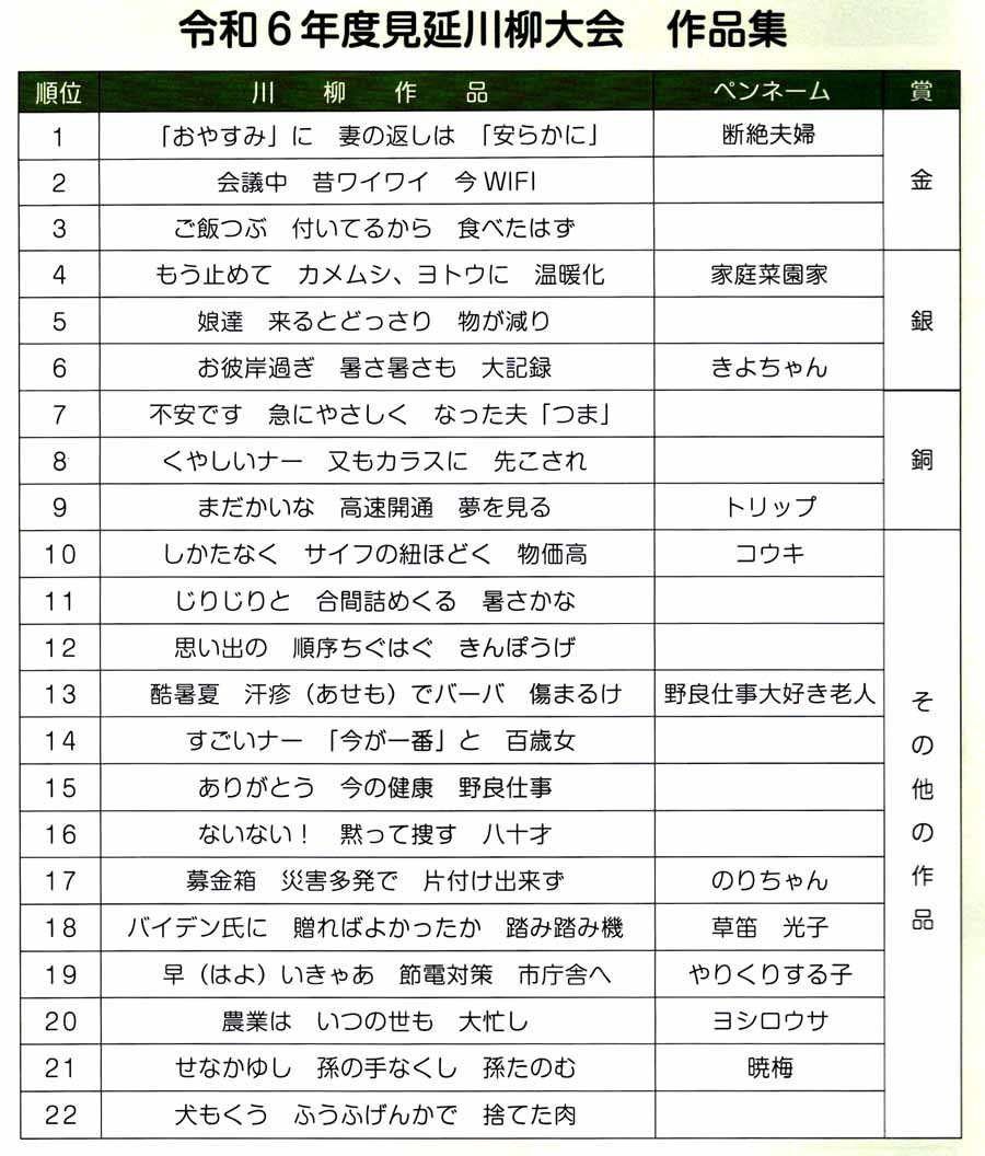 みのべ せんりゅう たいかい 見延川柳大会 今年も新型コロナの影響で多くの行事・活動が中止となりました。少しでも明るく楽しい話題づくりのための「見延川柳大会」です。日常の出来事からユーモアや風刺でクスッと笑えるようなエピソードが見えてきます。 過去の結果は、下に掲載しています。