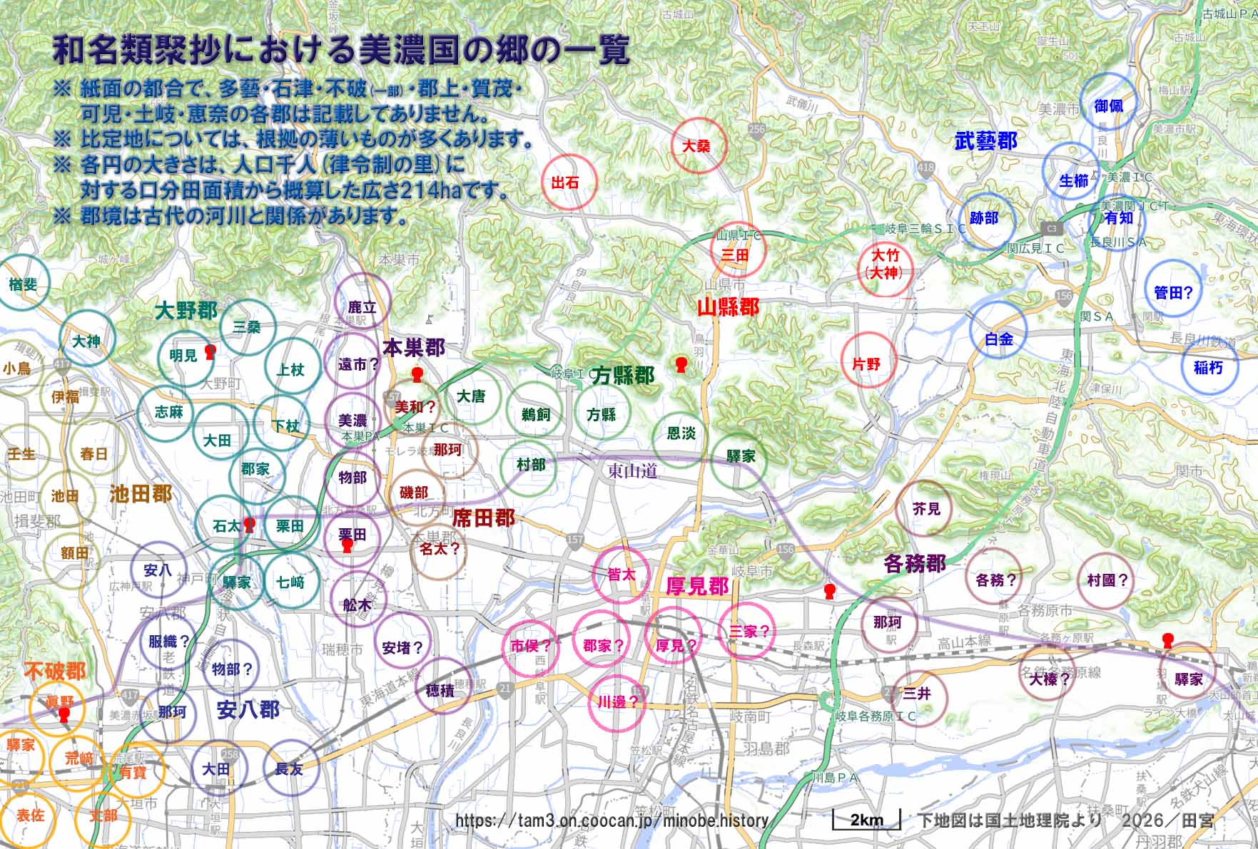 旧武芸津国(北部の山地:山県郡・武芸郡〜郡上郡)は、農地ができる広い平地空間が少なく、互いの円が離れているが、実際は点在していた狭い平地をまとめて、比定地を中心に広範囲で郷(里)を編制していたものと思われます。
